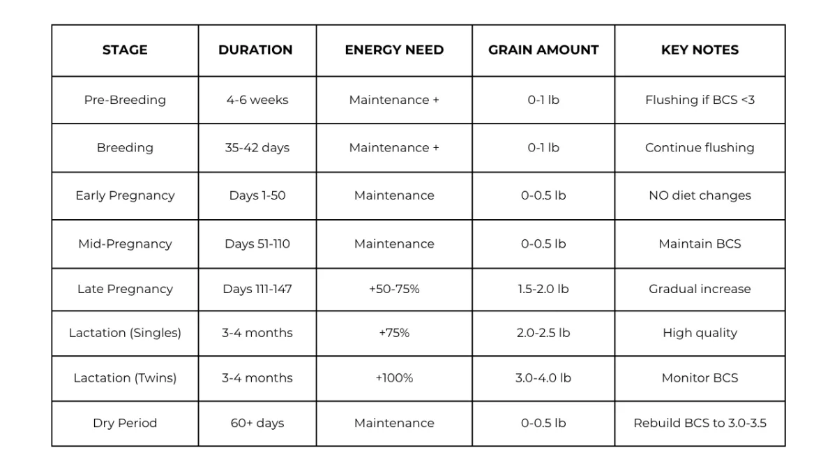 • Maintain or slightly increase grain for flushed ewes - If you've implemented a flushing program for ewes with BCS below 3.0, continue the supplemental grain feeding (0.5-1 lb per head daily) through the first 4 weeks of the breeding period to maximize conception rates and support early embryo development; don't make sudden feed changes during breeding as this can disrupt the ewe's hormonal balance and reduce fertility. After the first 3-4 weeks of breeding (when most ewes have been bred and embryos are implanting), gradually taper grain supplementation over 7-10 days rather than stopping abruptly, because sudden diet changes during early pregnancy cause embryonic loss. For ewes that entered breeding at optimal BCS (3.0-3.5), maintain current nutrition without additional grain unless body condition begins dropping.