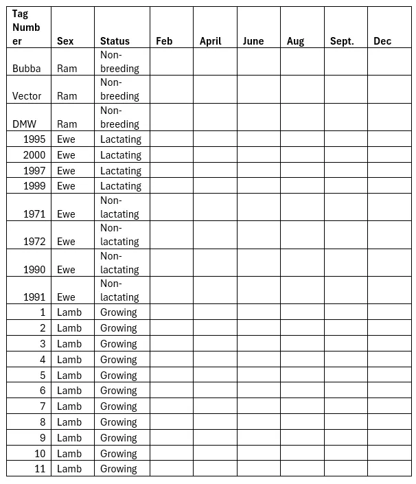 This comprehensive tracking chart is the backbone of our body condition scoring program, designed to monitor every animal in our flock across critical assessment periods throughout the year. The chart organizes animals by tag number, sex, and current status (non-breeding, lactating, non-lactating, or growing), with dedicated columns for monthly BCS assessments in February, April, June, August, September, and December—strategically timed to align with key production stages.