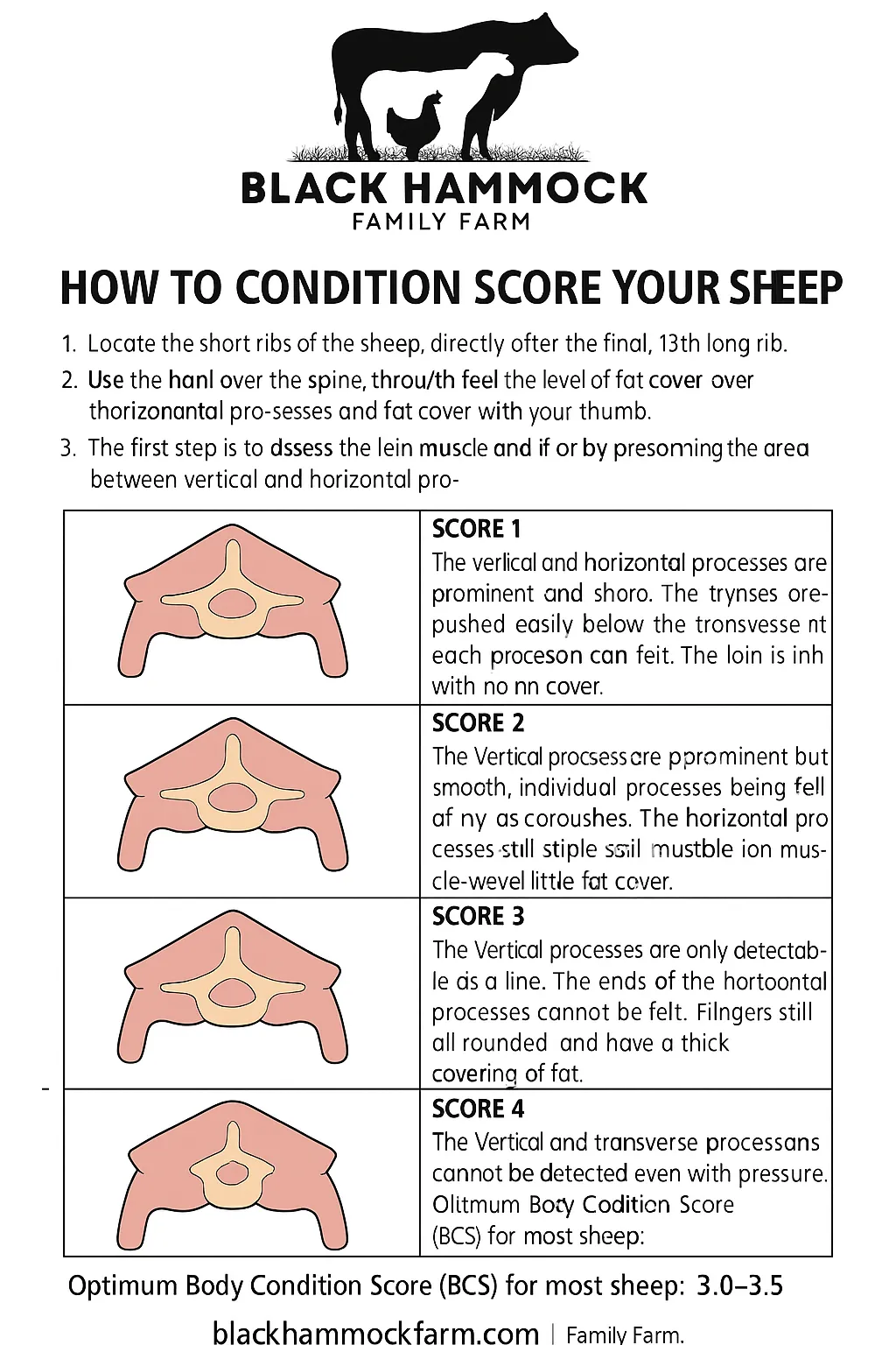 Body Condition Scoring (BCS) is one of the most powerful management tools available to sheep producers—a simple, hands-on assessment that reveals whether your flock has the body reserves needed for optimal health, reproduction, and productivity. Using a standardized 1-to-5 scale, BCS evaluates the amount of fat and muscle covering a sheep's lumbar region, providing crucial insights that guide feeding decisions throughout the production cycle. This comprehensive guide walks you through Black Hammock Farm's BCS protocol, teaching you exactly what to feel for, when to score, and what management actions to take.