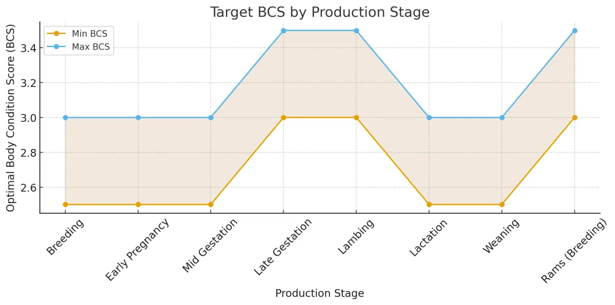Over-conditioned sheep (BCS >3.5 outside lambing): Reduce concentrate feeds, increase fiber, prevent metabolic disorders