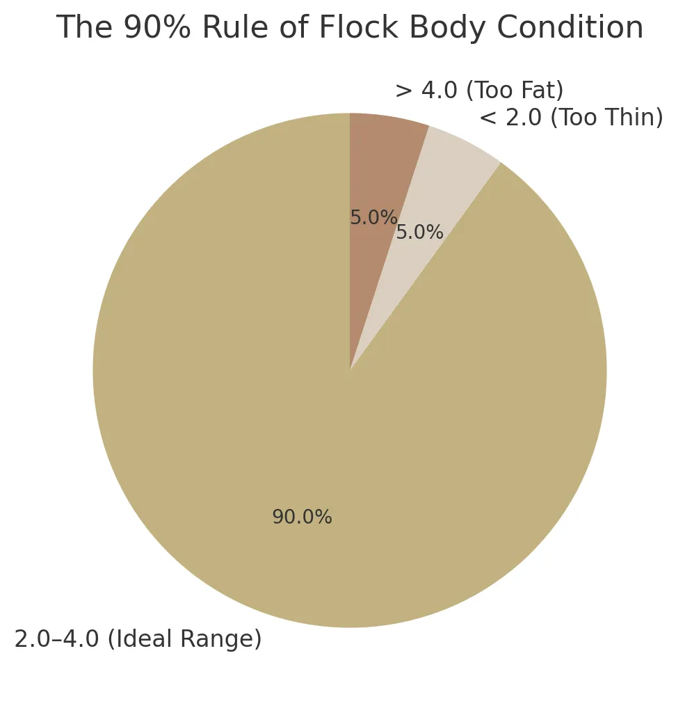 In a well-managed flock, approximately 90% of animals should score between 2.0 and 4.0. Animals scoring below 2.0 require immediate intervention, while those above 4.0 need reduced energy intake to prevent health complications.